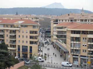 Näköaloja GTP:n kattoterassilta; taustalla häämöttää Sainte-Victoire-vuori. Harmi, että oli pilvinen päivä!